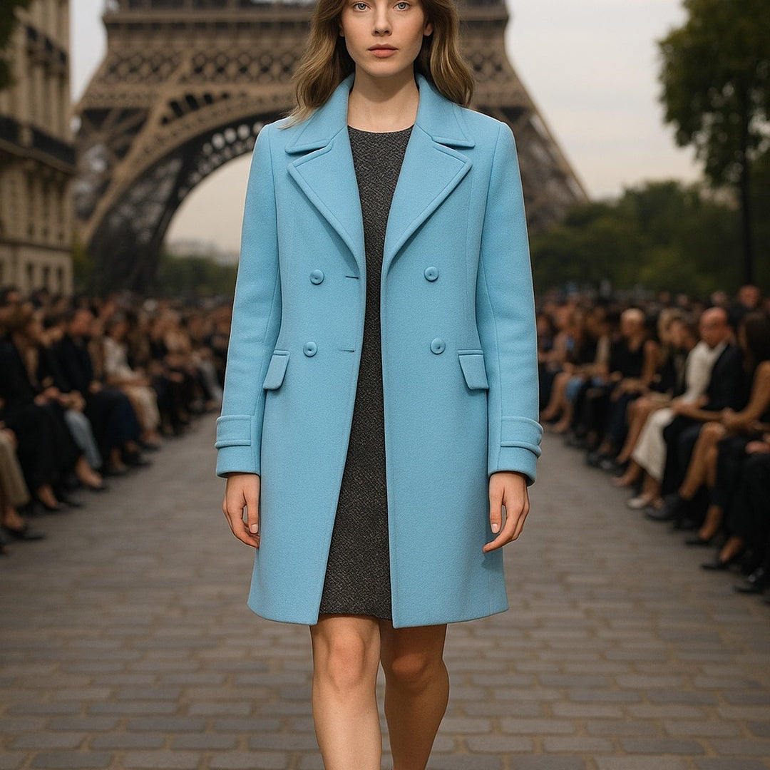 Il colletto a revers classico, ampio e leggermente arrotondato, incornicia il viso con delicatezza, mentre la chiusura a doppi bottoni sottolinea la verticalità della figura, slanciando la linea del corpo.